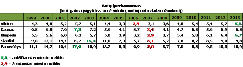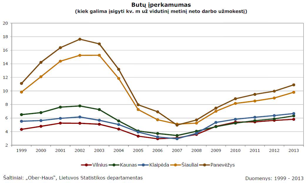 „Ober-Haus“ duomenimis, nuo 2007-2008 m. butų kainos Lietuvos didmiesčiuose vidutiniškai yra sumažėjusios beveik 40%. Tuo tarpu nominalus vidutinis darbo užmokestis per pastaruosius 6 metus, priklausomai nuo konkretaus regiono, yra išaugęs apie 25-30%. Todėl statistiškai didmiesčių gyventojai šiuo metu jau gali įsigyti 2 kartus daugiau ploto nei per būsto kainų piką 2007-2008 m. „Ober-Haus“ specialistai, įvertinę 2013 m. devynių mėnesių būsto kainas ir pirmųjų dviejų šių metų ketvirčių atlyginimus konkrečiuose miestuose, nustatė tokius būsto įperkamumo rodiklius: Vilnius – 5,8 m2 (žemiausias rodiklis 2006 m. – 2,9 m2), Kaunas – 6,3 m2 (2007 m. – 3,4 m2), Klaipėda – 6,7 m2 (2007 m. – 2,9 m2), Šiauliai – 9,8 m2 (2007 m. – 5,1 m2) ir Panevėžys – 10,9 m2 (2007 m. – 5,1 m2). Reikėtų pažymėti, kad šiuo metu Vilniuje ir Klaipėdoje fiksuojamas aukščiausias įperkamumo rodiklis per pastaruosius 15 metų.