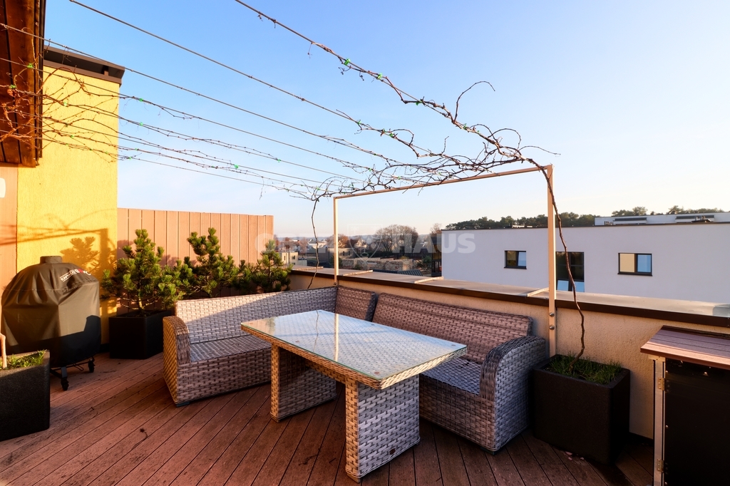 An exclusive 4-room apartment on two floors is for sale. This is a unique home that combines comfort, privacy and a relaxation oasis. The terrace is planted with plants - a great place to enjoy sunsets and cozy evenings. ADVANTAGES: • Apartment on two floors with a private terrace on the roof (48.42 m²) • Planted terrace - ideal for relaxation • 3 bedrooms and a spacious living room connected to the kitchen • 2 bathrooms: one with a bubble bath, the other with a shower • Underfloor heating in the kitchen and bathrooms • Soundproofing - walls and doors are additionally insulated • Autonomous gas heating, air conditioners on both floors • Underground parking space with an electric charging station (optional) • Storage room in the basement (optional) • Cozy lighting in the apartment and on the terrace; speakers installed on the terrace • There is an air conditioner and a dishwasher BASIC INFORMATION: • Location: Kaunas, Žemutinai Kaniūkai, Įkalnės aklg. • Apartment area: 101.65 sq. m (3 bedrooms + living room with kitchen) • Terrace area: 48.42 sq. m • 3/3 floor • Balcony: from the living room, overlooking the courtyard of the block • Apartment condition: newly furnished, well maintained • Furniture: by agreement • Heating: autonomous gas, underfloor heating in the kitchen and bathrooms • Windows: new, sealed • Parking: underground space with electric charging; additionally, possibility of renting HOUSE INFORMATION: • Construction type: brick • Underground parking space • Storage room in the basement • Tidy house environment, active community, clean staircases ENVIRONMENT AND INFRASTRUCTURE: • Convenient location - good communication with the center of Kaunas, highway and bypass • Nearby Romainiai forest, Lampėdis lake with a beach and water entertainment • Nearby shopping centers, medical and service institutions • Tidy, safe and well-maintained environment