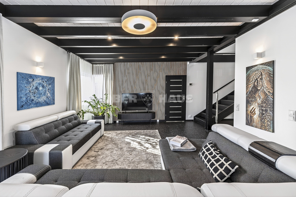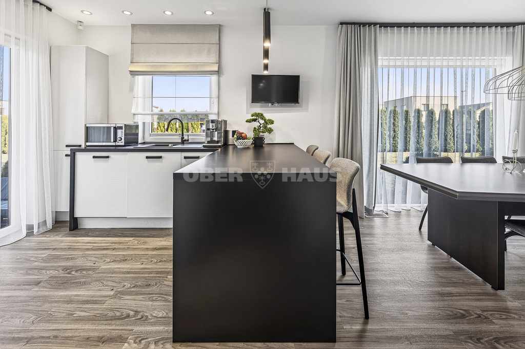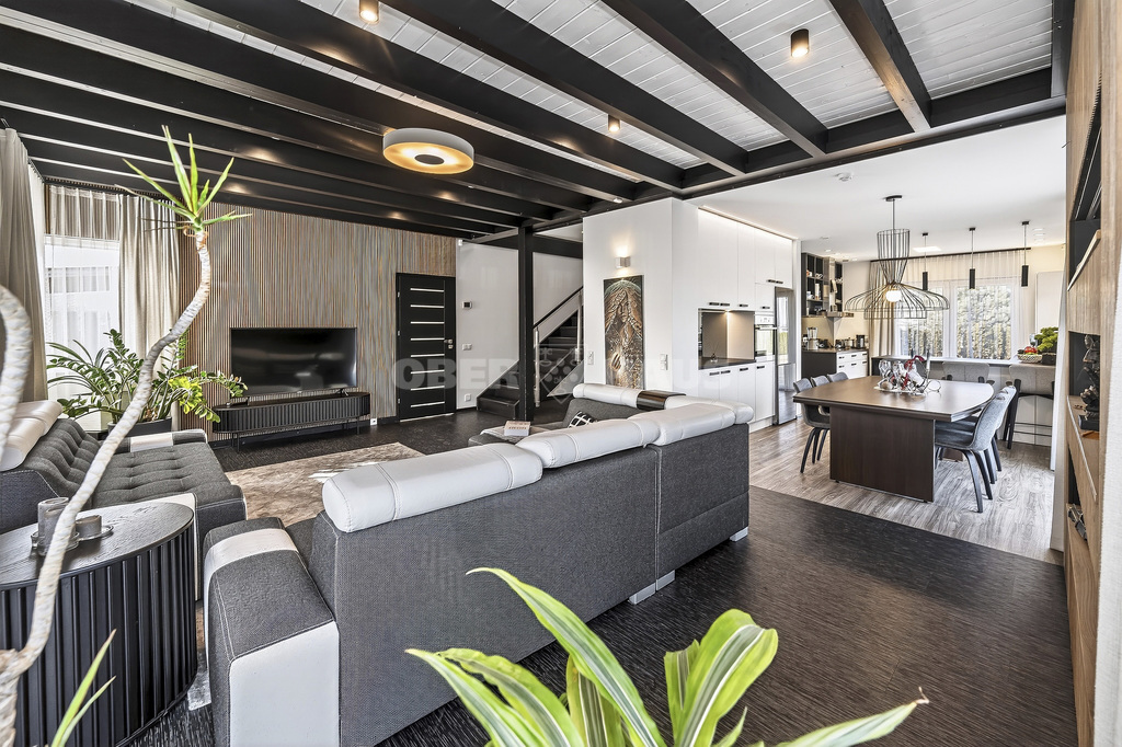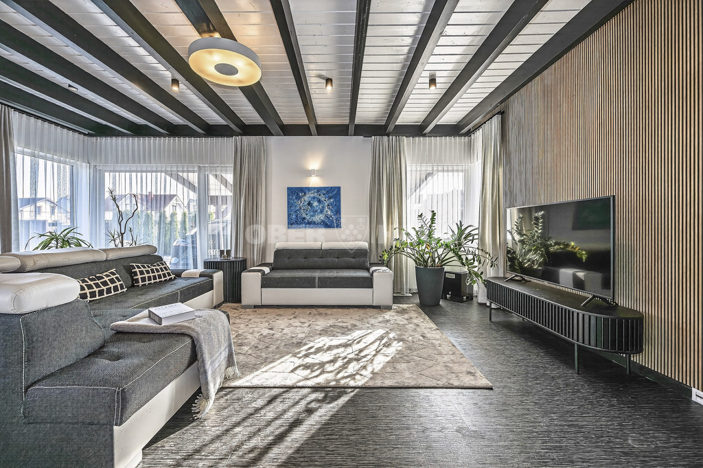 The house is built using high-quality materials and features modern interior solutions. Large panoramic windows provide an abundance of natural light, while the open-plan living room, kitchen, and dining area create a perfect space for family gatherings.