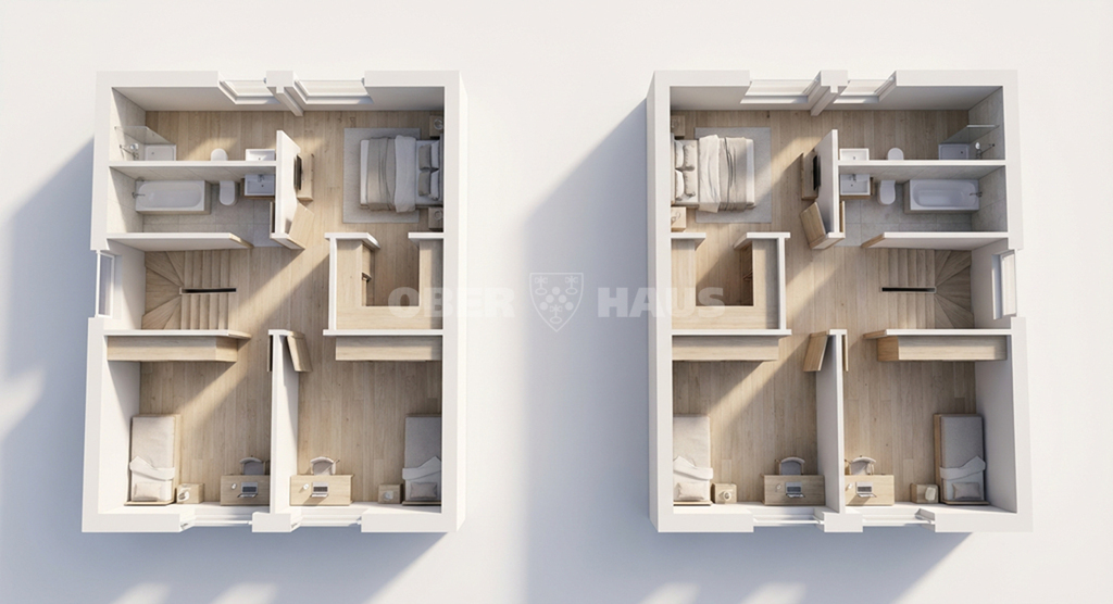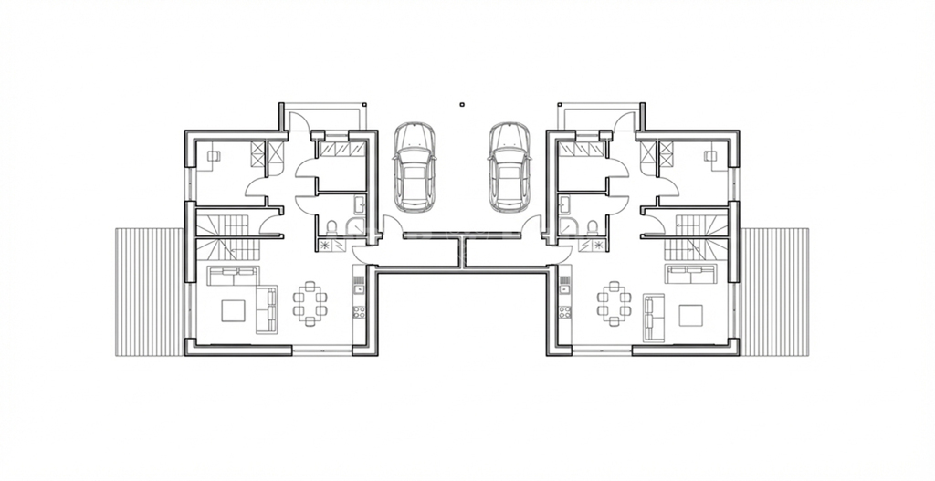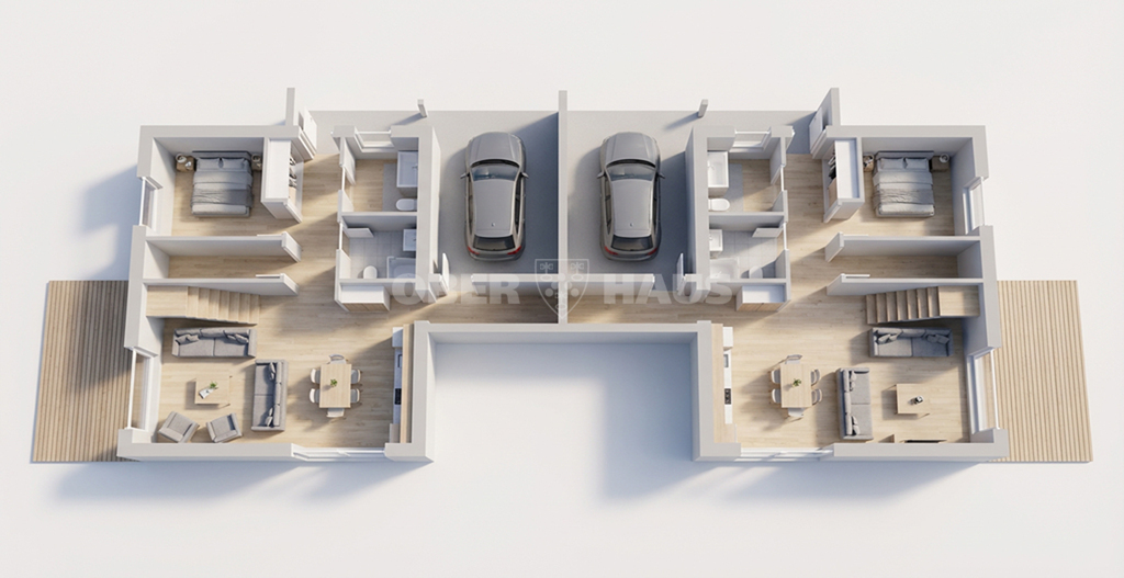 Comfortable U-shaped stairs connect both floors. The house is connected to the neighbouring unit through a carport, ensuring greater privacy and reduced noise.