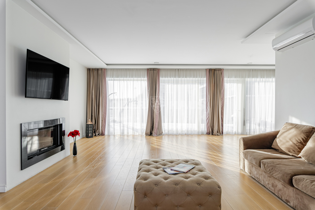 • Spacious living room with fireplace and large floor-to-ceiling windows