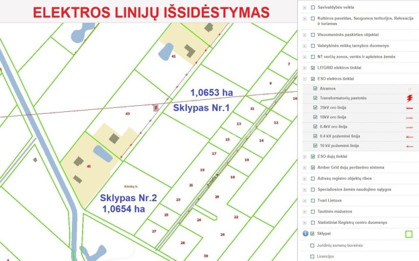 Į sklypus yra atvesta elektra. 30 m nuo mažojo sklypo yra geriamo vandens tiekimo trasa (šulinys).